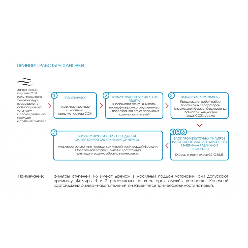 Использование соответствующего аспирационного оборудования для фильтрации масляного тумана в большинстве случаев позволяют избежать его попадания в воздух рабочих помещений. Подключение установки к защитному кожуху токарно-фрезерного станка многократно уменьшает попадание масляного тумана за пределы кожуха в процессе работы.