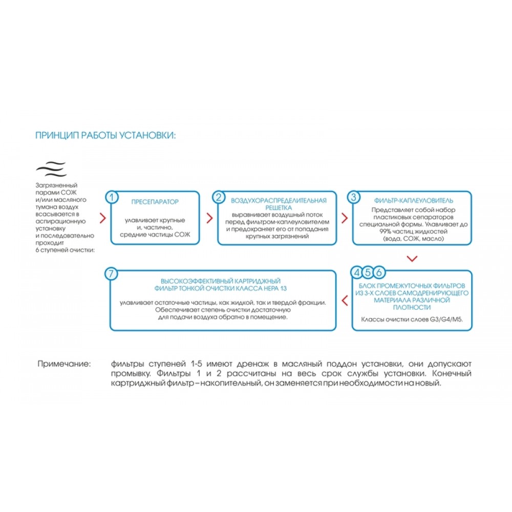 Использование соответствующего аспирационного оборудования для фильтрации масляного тумана в большинстве случаев позволяют избежать его попадания в воздух рабочих помещений. Подключение установки к защитному кожуху токарно-фрезерного станка многократно уменьшает попадание масляного тумана за пределы кожуха в процессе работы.