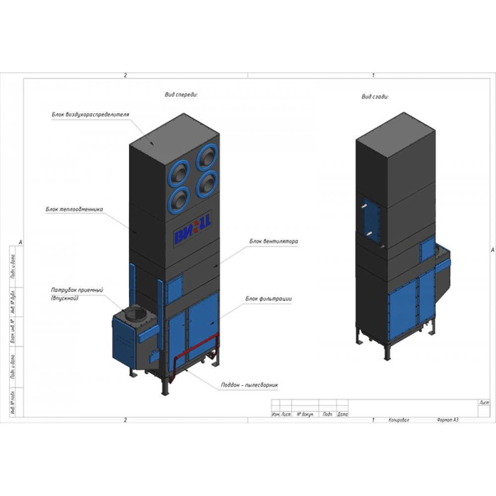 Дополнительные блоки, в том числе блок-теплообмена устанавливаются в виде надстройки над основной вентиляционно-аспирационные установкой, при этом изменяется только общая высота установки.