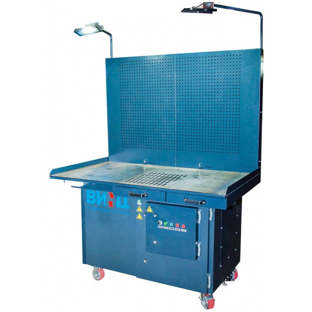 Стол представляет собой эргономичное рабочее место со столешницей и задней перфорированной панелью. Столешница установлена на фильтровально-вытяжном модуле ВАУ МТ «КАМА» 1500. Загрязненный воздух отводится непосредственно в модуль, где очищается от механических примесей. Очищенный воздух подается обратно в помещение. Фильтровально-вытяжной модуль оснащен встроенным EC-вентилятором с регулировкой оборотов, патронным фильтр-элементом с автоматической системой регенерации.